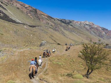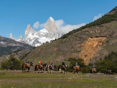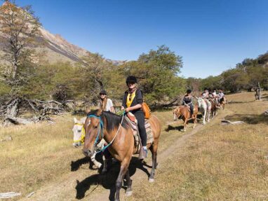 We will ride the horses for approximately 2 hours. Starting from the corrals we will tour the entire Vizcacha canyon and its spectacular mallín. Before entering the forest, in the pampita, we can enjoy a panoramic view of Cerro Chaltén. Then, already in the lenga and ñire forest, we will advance in constant and slight ascent until we reach La Lita Lagoon. Once at the place, and while lunch is being prepared, we will take a short walk to the Laguna Cóndor viewpoint. After lunch, we will begin the return.
