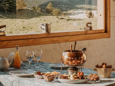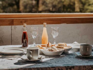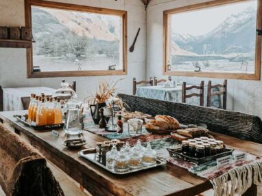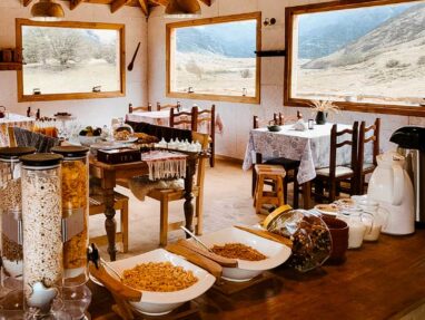 Our breakfast space overlooks the Bosque River Valley and the Chaltén mountain range. The breakfast buffet includes a variety of homemade pastries with sweet and savory options.